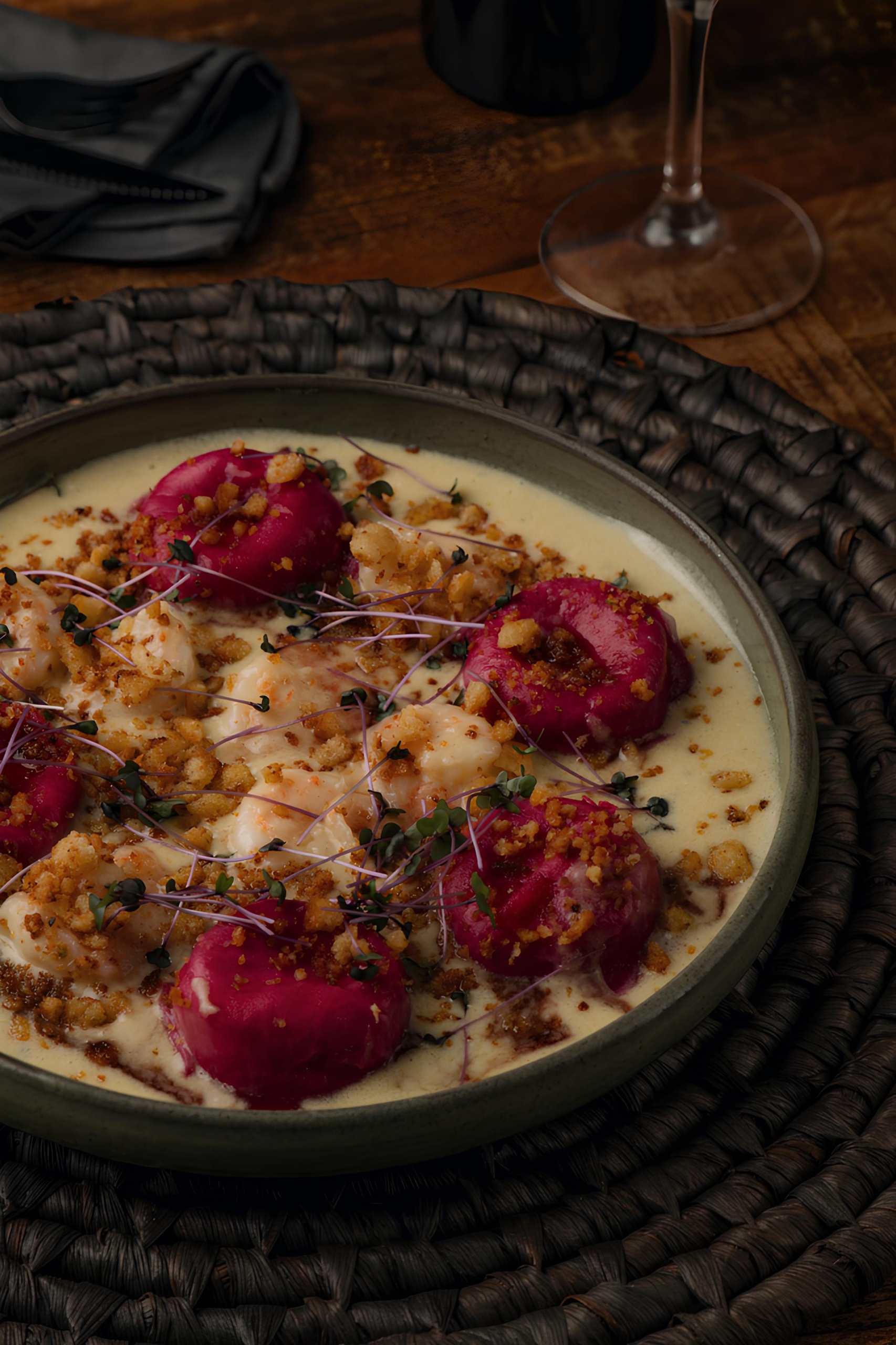 - Sorrentino de Brie e Camarão: Massa recheada com queijo brie, acompanhada de camarões grelhados e um blend de molho quatro queijos e calda de hibisco.